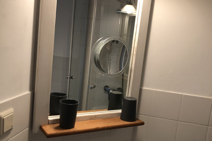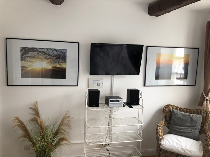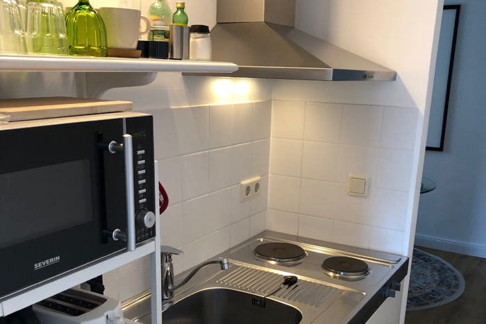 1 Doppelbett 1,80 x 2m, Flachbildfernseher, Stereoanlage, WLAN, Pantryküche mit 2 Platten E-Herd, Kühlschrank mit Eisfach, Spüle, Kombi-Mikrowellenofen, Wasserkocher, Kaffemaschine, Toaster, Kochgeschirr und Geschirr für 2 Personen, am Esstisch steht ein Stuhl und ein 2 Sitzer Esstischsofa, Kleiderschrank 1m, Dusche, WC, Handwaschbecken, Fön.